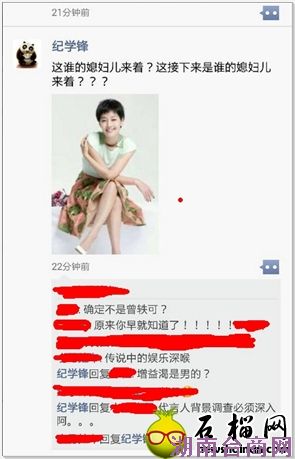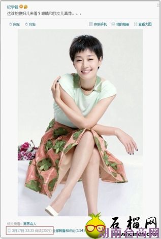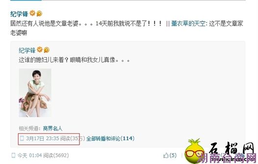 消息称,微博认证博主、游戏公司巨人网络总裁纪学锋在两周前(3月17日晚间23:35)发出一条耐人寻味的微博,微博配图是一张马伊琍坐着的写真照,配文“这谁的媳妇儿来着?眼睛和我女儿真像。。。”这条微博当时未引发众人关注,但在今天凌晨文章、马伊俐两人微博发声确认文章“出轨门”之后,该条微博被人肉出来并疯转。