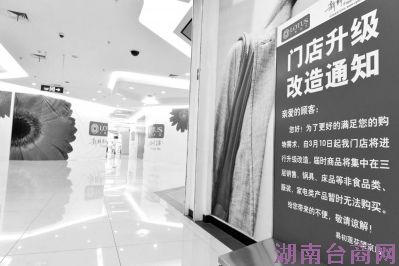 昨天晚上,记者在该店发现,目前仅三层还在营业,但是很多货架都是空的。上面也贴有告示:“因门店改造,本商品暂无货”。超市几乎没有看到服务员,顾客也特别少。