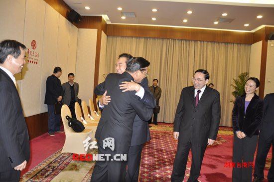 湖南省委副书记梅克保、海协会副会长李炳才等到黄花机场迎接江丙坤及海基会大陆华中台商访问团一行,梅克保、李炳才以及湖南省委常委、统战部长李微微参加会见。