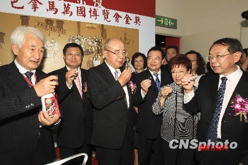 3月24日下午,由贵州省副省长谢庆生率领的“2010台湾·感知多彩贵州”活动在台北101大楼开幕,为期5天的“感知多彩贵州”活动,包括民族歌舞表演、民族工艺品和服饰展示、黔山名茶与国酒茅台品尝、贵州民族文化保护与传承恳谈会等。图为中国国民党荣誉主席吴伯雄(左三)由贵州省副省长谢庆生(右一)陪同在开幕式上品尝茅台酒。