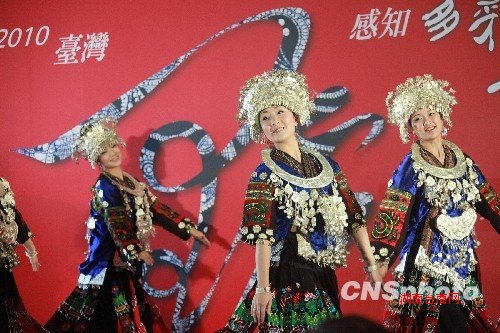 3月24日,“2010台湾·感知多彩贵州”大型文化交流活动开幕式及展演活动在台北的最高楼101大楼举行。图为贵州团进行少数民族服饰展演。