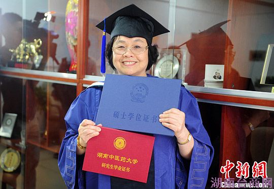 6月10日,在湖南中医药大学的毕业典礼上,来自台湾台北市的苏彩华拿到了湖南中医药大学针灸推拿学硕士学位与毕业证。现年66岁的苏彩华,成为了当日毕业生中最年长的一位。一直对中医热爱的她,退休后潜心自学中医。在台湾自学8年中医之后,她如愿以偿考上了湖南中医药大学针灸推拿学的硕士研究生。“我的梦想是成为一名中医师,把自己所学带回台湾,去帮助更多需要帮助的人。”苏彩华表示,现在所有在大陆学习中医的台湾学生与学成归台的人,都在台湾有关方面承认大陆中医学历与中医师执照的这天到来,这样才能更好促进两岸中医的交流。