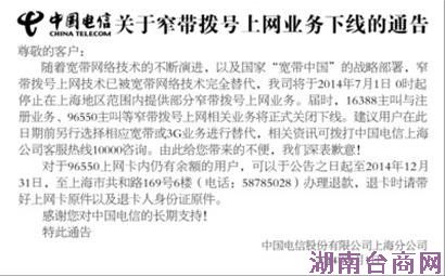 上海电信发布公告宣布,将于7月1日零时起停止本市范围内的窄带拨号上网业务,届时,16388主叫与注册、96550主叫窄带拨号上网相关业务将正式关闭下线。上海电信提供的数据显示,目前上海地区大约还有将近一万用户在使用窄带拨号业务,这部分用户主要为POS机及福利彩票网点的用户。