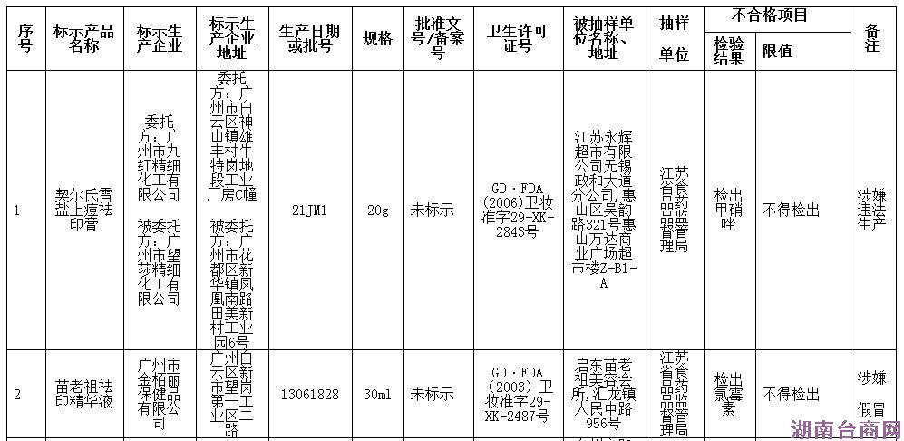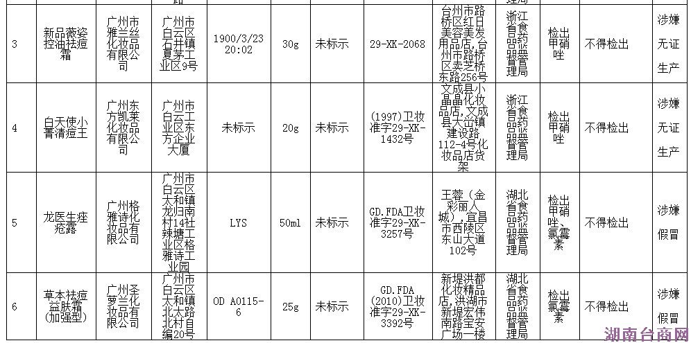 新华食品6月25日电 国家食品药品监督管理总局(以下简称:食药监总局)24日公布了对宣称祛痘/抗粉刺和美白/祛斑类化妆品的国家监督抽检结果,6批产品检出禁用物质。其中,其中,契尔氏雪盐止痘祛印膏、苗老祖祛印精华液、苗老祖祛印精华液、白天使小菁清痘王、龙医生痤疮露均检出禁用物质“甲硝唑”;龙医生痤疮露、草本祛痘益肤霜检出禁用物质“氯霉素”。(不合格名单详见附件)