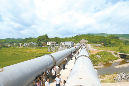 | 长长的管道像两条长龙,将浏阳市株树桥水库的水源源不断地输送到长沙城区,为省会长沙城区提供饮用水源。本报记者 刘尚文 摄 |