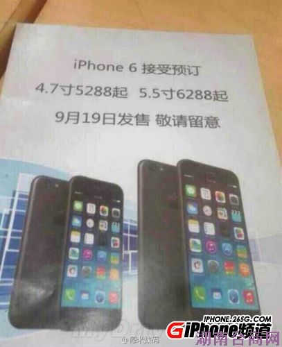 微博网友@德米数码 近日曝光了一张疑似国行iPhone 6的预订宣传海报,海报显示,iPhone 6 4.7寸版价格5288元起,5.5寸版价格6288元起,9月19日正式发售。