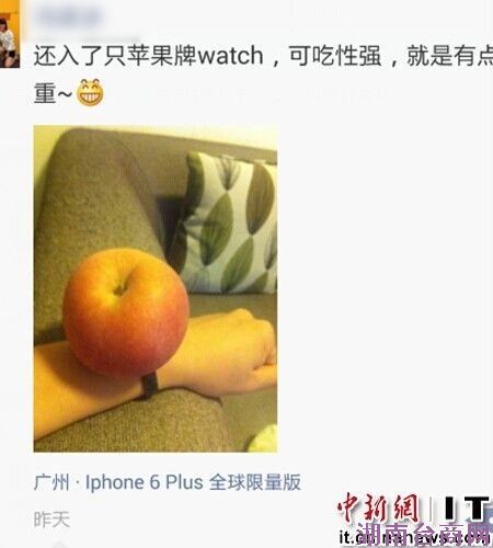 网友对于苹果产品的玩味还不止于此,在iPhone6发布之前,网友就频频产生一些调侃论调与可爱举动,有“屌丝”网友发明人体器官价位表。以及“只能帮到这了,果粉们你们准备好割哪了吗?”等调侃言论。甚至有网友将一个苹果放在手臂上,调侃道“苹果牌watch,可吃性强,就是有点重”。看来,尽管短时间内苹果新品可望不可即,但仍不影响网友这种取悦自己、取悦大众的“玩坏”心情,同时也让大众感受到果粉对于新品的热情与追捧。(中新网IT频道)