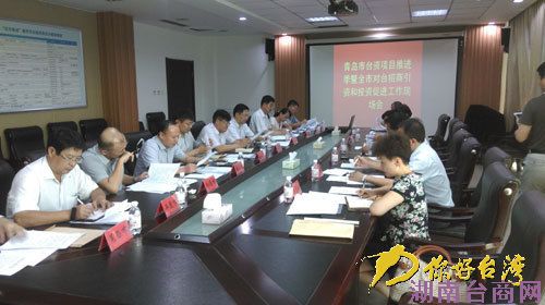 你好台湾网胶州8月28日消息(通讯员 任华)近年来,青岛与台湾经贸交流合作不断取得积极成果,在青台资企业稳健成长,特别是“2013台湾?山东周”期间,青台双方签订多项合作合同协议。为进一步贯彻落实省台办“台资项目推进季”和青岛市调结构、稳增长、抓落实现场推进活动要求,推动一批在谈、在建优质台资项目,做好新形势下对台招商和投资促进工作,2014年8月26日,“青岛市台资项目推进季暨全市对台招商引资和投资促进工作现场会”在我市召开。青岛市委副秘书长、台办主任田云南、副主任程文浩及青岛市所辖十个区市的台办主任参加了此次会议。
