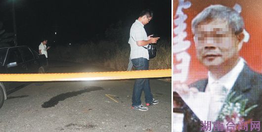 施姓富商(右图)遭绑架撕票,遗体昨天在台南市楠西区产业道路的草丛被发现,警方围起封锁线(左图)。