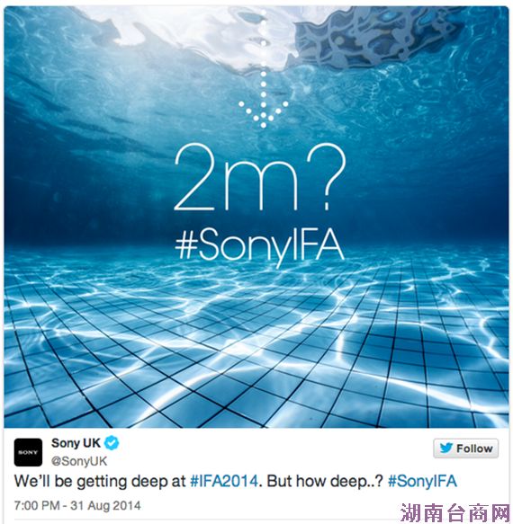 前不久,索尼英国在社交网络上发布了这张图片。“我们将在IFA2014潜得更深,但是到底有多深?”索尼跟网友卖了个大关子。不过硕大的2m字样似乎在明示这款产品将可在2米深的水下工作。