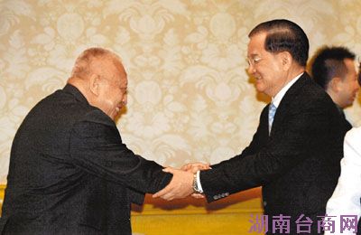 国民党荣誉主席连战(右)30日晚间在西华饭店宴请前香港特首董建华(左)。(图片来源:香港文汇报)