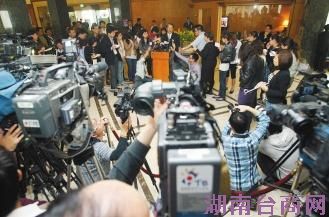 两岸第二次ECFA协商台方主谈人“国贸局长”黄志鹏(站讲台者),中午休息时对大批守候媒体谈协商内容。