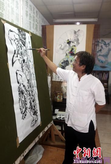 在新北市莺歌镇他的艺术创作工作室,记者看他飙画,确实很快,一幅“八家将”,寥寥几笔,着墨彩色,形神皆备,须臾完成,运用地正是中国意笔画的精髓,注重人物神韵的捕抓,形神皆备的追求。