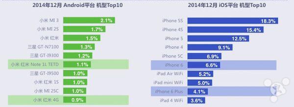 安卓平台主要机型以小米与三星占据主流,而 iOS 平台 iPhone 6 系列占比已经超过 10%。
