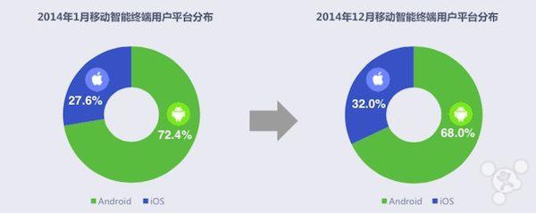 iOS 用户对操作系统的更新行为更加积极,使用 iOS 8.0 以上版本的用户达四成以上。具体的情况是 iOS 8.0 的占比达到 2.1%,8.0.2 为 4.3%,8.1 为 9.7%,8.1.1 为 17.1%,8.1.2 为 7.9%。