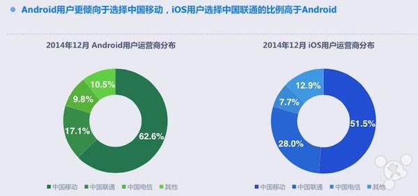 在运营商选择方面,安卓用户更倾向选择中国移动,而 iOS 用户选择中国联通的比例高于安卓。