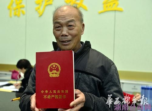 3月1日,在江西崇义县不动产登记中心第一位领取到不动产权证书的居民林仁群手捧证书留影。