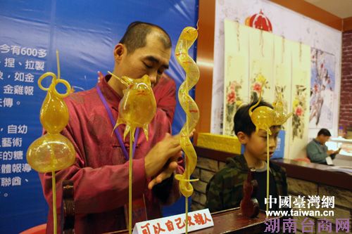 非遗传人现场为台北市民展示传统糖人的做法。