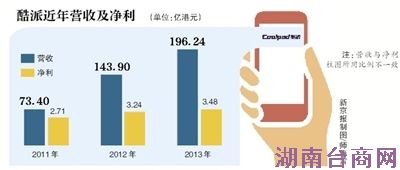 酷派2014年的半年报则显示,酷派营业收入为149.34亿港元,同比增长54.8%;实现净利润约4.12亿港元、同比增长94%。不过其净利润率仅在2.76%左右。