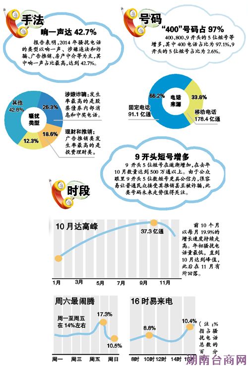 临近春节,又到各路骚扰电话“狂轰滥炸”时。2月3日,搜狗号码通联合北京地区网站联合辟谣平台发布了《2014骚扰电话年度报告》。数据显示,2014年全国骚扰电话总数高达270亿通,其中涉嫌诈骗类骚扰电话达到26.3%。值得关注的是,广东成为骚扰电话最大的发源地,一年呼出35.1亿通骚扰电话。