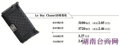 据美国《女装日报》报道,11.12款手袋在中国内地的售价从先前的3.82万元降到3万元,与涨价后的欧洲价格相比,价差从1.47万元缩小到1800元;le Boy手袋中国内地的价格从原本的3.27万元下调至2.6万元,两地差价缩小至1400元。