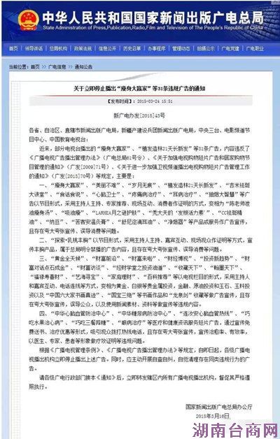 根据《广播电视管理条例》、《广播电视广告播出管理办法》等规定,自即日起,各级广播电视播出机构立即停止播出上述广告。同时,应主动开展自查自纠,自觉清理存在同类违规行为的广告。