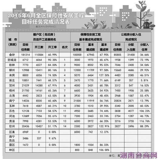 自治区住建厅相关负责人介绍,今年广西保障性安居工程国家目标任务是开工21.72万套(户),基本建成9.58万套,全年计划总投资240亿元;另外,广西自我加压,主动要求年内完成各类棚户区改造项目开工18.13万套以上,新增分配入住10万套。