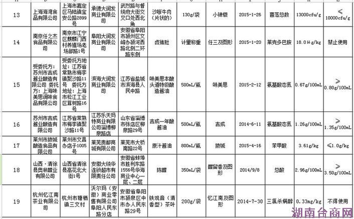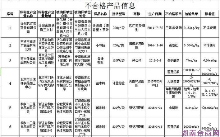 新华食品北京7月8日电(李楠)国家食药监总局7日公布新一期的食品抽检名单,本次抽检涉及13家经营企业负有经营销售不合格食品的责任,其中沃尔玛(安徽)商业零售有限公司阜阳人民东路分店抽检的杭州“忆江南”铁观音检出农药三氯杀螨醇;阜阳大润发商业有限公司颍河西路店抽检的南京任之杰食品有限公司生产的卤猪肚因检出禁止使用的莱克多巴胺被通报。