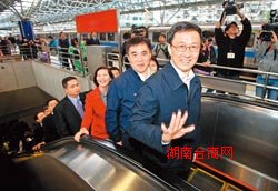 ▲上海市长韩正(右)7日在台北市长郝龙斌的陪同下搭手扶梯,体验台北捷运的便捷。