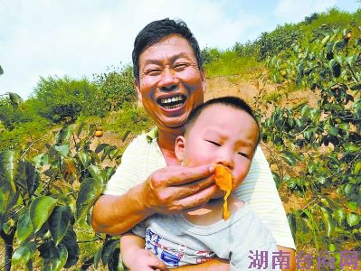 满山的柿子红了,老李带着从台湾前来探亲的儿子上山品尝,儿子狼吞虎咽的样子逗得老李哈哈大笑。