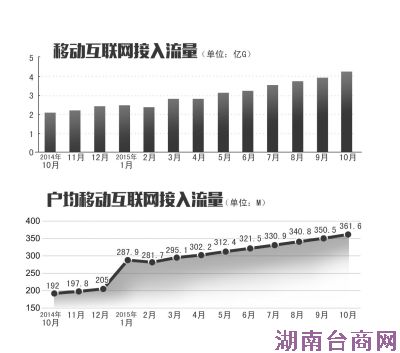 工信部公布的10月份通信行业运行数据显示,10月当月移动互联网接入流量达4.2亿G,创历史新高。1-10月累计达32.1亿G,同比增长100.2%,比1-9月同比增速提升0.8个百分点。月户均移动互联网接入流量达到361.6M,同比增长88.3%。手机上网流量达到28.8亿G,连续10月实现翻倍增长,占移动互联网总流量的89.7%。