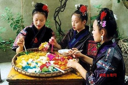 姊妹节美丽的传说来自长达五百多行的《姊妹节歌》。相传,有一对姐妹的子女,男的叫金丹,女的阿姣,从小青梅竹马,彼此相爱,可按照旧时苗家习俗“还娘头”,就是舅家优先娶姑家女儿为媳。阿姣不愿嫁舅家,金丹也不愿娶别的姑娘,因为怕父母发现,两人只能常在野外偷偷约会。每次,阿姣都用她装针线的竹篮偷偷地藏着饭带去给金丹吃。年复一年,阿姣终于感动了父母,同意她与金丹结成夫妻。于是便有了“姊妹饭”的典故,苗语叫带给情人吃的食物为“藏饭”,意译古来就变成了“姊妹饭”。