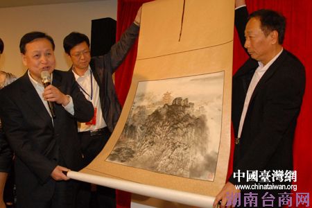 湖北省委书记罗清泉向鸿海集团董事长郭台铭赠送礼品。(中国台湾网湖北通讯员 陆胜 摄)