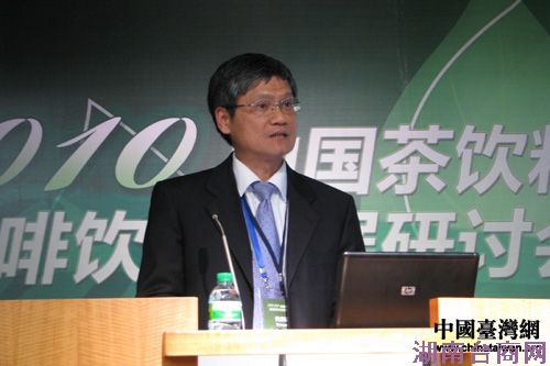 康师傅控股有限公司中央研究所所长杨乾辉作《大陆茶饮料市场未来发展趋势》的演讲。(中国台湾网 肖燕 摄)