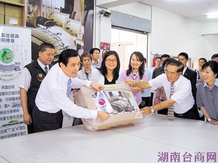 马英九参与亿进寝具棉被的制作流程后,与“陆委会”主委赖幸媛,亲自将代表台湾制造的MIT标志贴上。图片来源:台湾《中国时报》 中新网5月6日电 据台湾《中国时报》报道,针对签订两岸经济合作框架协议(ECFA)一事,马英九昨天亲自与四十五位台湾传统产业代表面对面沟通。