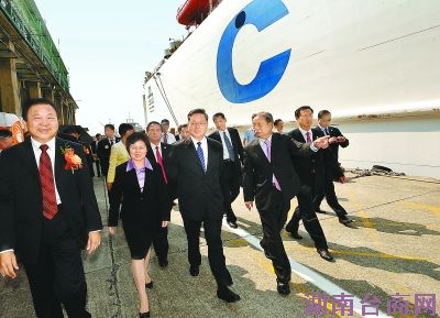 10日上午,两岸之间唯一一艘获批的常态化定期班轮——“中远之星”轮成功从厦门港首航高雄港。省领导黄小晶、陈桦、叶双瑜、苏增添一行出席首航仪式并鉴证厦门港务局与高雄港务局、厦门海沧保税港区与高雄自由贸易中心现场签署合作协议。初夏的高雄港海天一色、潮平浪阔,黄小晶一行登船出海,考察这一台湾最负盛名的天然良港。在与当地交通部门负责人交谈过程中,黄小晶说,“中远之星”轮继开通台中港、基隆港航线之后,再增加高雄港航点,首次开通厦门至高雄港客货滚装航线,创新了海峡两岸现有的海上运输模式,实现了真正意义上的客货直航。希望两岸能够携起手来,致力于推动更多的直航班轮实现常态化运营,特别要争取直航班轮与旅游精品线路和物流配送相结合,带动台湾南部与大陆之间在旅游业、农产品供销等方面更深入的交流,以实际行动为两岸同胞多谋福祉。