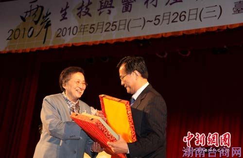 5月25日,前全国人大常委会副委员长、海峡两岸医药卫生交流协会名誉会长何鲁丽,在台北出席“两岸生技与医材产业合作及交流会议”。图为何鲁丽向台湾方面代表互赠纪念品。 中新网记者 董会峰摄