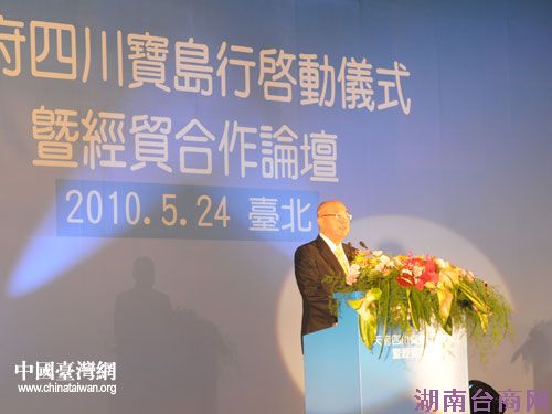 中国国民党荣誉主席吴伯雄等在“天府四川宝岛行启动仪式暨经贸合作论坛”上致辞。(图片来源:四川台办)