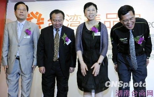 5月26日,台湾高科技知名品牌的企业领导人在北京举行新闻发布会,介绍即将在第十三届中国北京国际科技产业博览会上亮相的的“台湾精品馆”。图为台北世界贸易中心处长李惠玲女士(右二)、友讯科技公司执行长曹安邦(左二)、美利达公司总经理许世彦(右一)和雷虎科技公司董事长赖春霖(左一)等出席仪式。 中新社发 刘震 摄