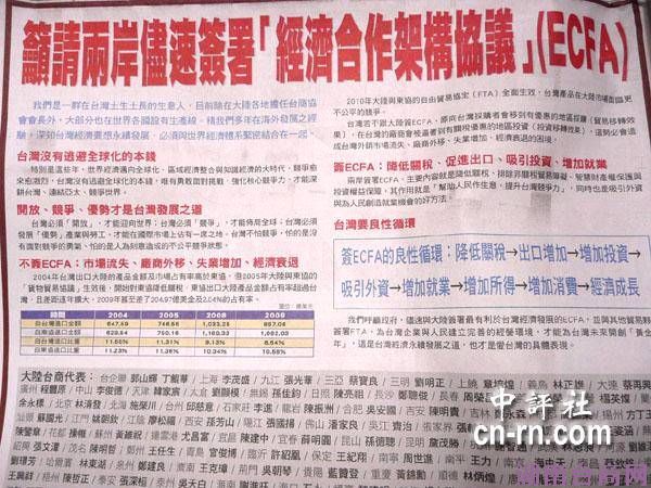 台海网6月7日讯以台企联总会长郭山辉为首的108名大陆台商今天在台湾报纸刊登半版广告,呼吁政府尽速与大陆签署有利于台湾经济发展的ECFA。
