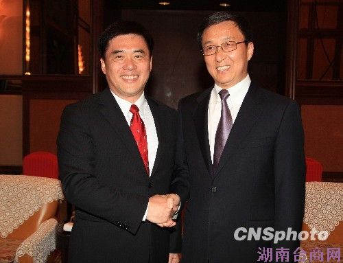 6月14日晚,上海市长韩正(右)在上海万豪虹桥大酒店会见并宴请台北市长郝龙斌一行。 中新社发 潘索菲 摄