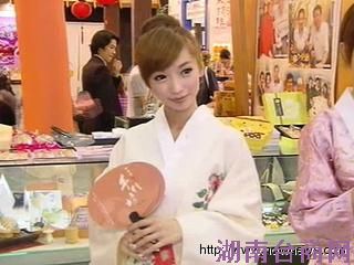 “欢迎试吃,很好吃喔!”秀场美女穿着日本和服打扮成樱花妹沿路发麻糬,其中一位还秀出修长美腿,不少男客人眼睛吃冰淇淋。