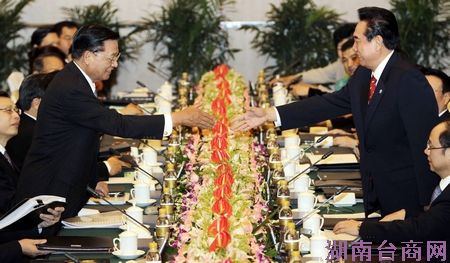海协会会长陈云林(右)和海基会董事长江丙坤(左)握手互贺ECFA签署。