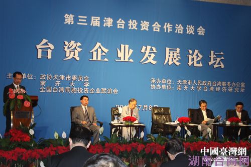 中国台湾网7月9日天津消息 7月8日下午,第三届津台投资合作洽谈会——台资企业发展论坛在天津君隆威斯汀酒店举行。与会两岸专家学者重点探讨ECFA签署后台资企业面临的新机遇、新空间,期冀为台资企业转型升级、拓展大陆市场提供借鉴。