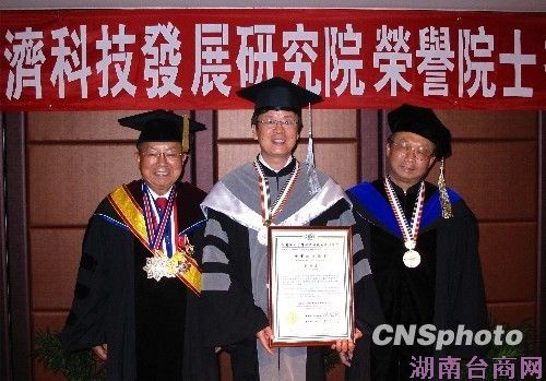 7月23日下午, 中国开发区协会会长刘培强获颁台湾经济科技发展研究院“荣誉院士”头衔,成为首位获此荣誉的大陆人士。图为台湾经研院董事长赵宜民(右)、总院长唐学斌(左)到北京为刘培强(中)举行了授证典礼。 中新社发 路梅 摄