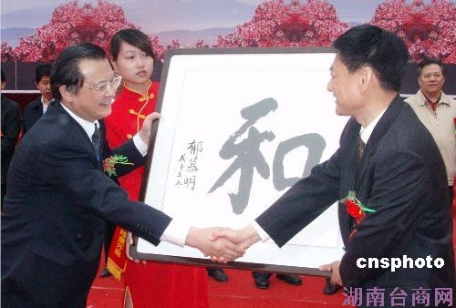 中新社永州四月二十八日电 (记者 傅煜)一幅由台湾新党主席郁慕明题写、满载台湾同胞对和平深深期盼的“和”字,今日被赠给湖南阳明山,成为海峡两岸血脉亲情的又一见证。