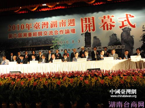 中国台湾网8月3日台北消息 8月3日下午,由湖南省海峡两岸交流促进会、台湾工业总会和台北世界贸易中心联合主办的“2010年台湾湖南周”暨第六届湘台经贸交流合作论坛在台北圆山饭店大会议厅隆重开幕,中共湖南省委副书记、湖南省代表团团长梅克保,中国国民党荣誉主席吴伯雄,亲民党主席宋楚瑜,海基会董事长江丙坤,台湾工业总会理事长陈武雄出席开幕式并致辞。