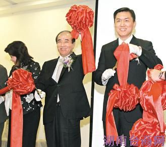 鸿海集团总裁郭台铭间接投资的华捷商务航空29日在松山机场举行启航典礼,总经理费鸿钧(右)和台“立法院长”王金平开心剪彩。费鸿钧表示乐观看待两岸商务专机市场潜力。记者潘俊宏/摄影