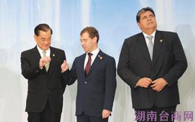 亚太经合组织会议14日闭幕,连战(左一)与俄罗斯总统梅德韦杰夫(左二)互动良好。右为秘鲁总统加西亚。 图片来源:台湾《联合报》