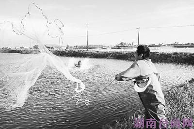 台湾渔民撒网捕捞虱目鱼。记者 杜榕摄